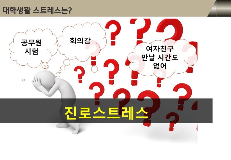진로스트레스란 무엇일까요? 진로스트레스란 자신의 적성이나 재능을 파악하고 앞으로 어떤 목표를 세우고 준비를 해야 하는지에 대한 어려움을 겪거나 진로를 선택하는 과정에서 부딪히는 문제 상황에 대한 불편함을 의미한다.단순한 진로를 결정할 수 없는 문제라기보다는 그로부터 파생되는 심리적 불안과 스트레스 문제를 내포하고 있다.Adi정리